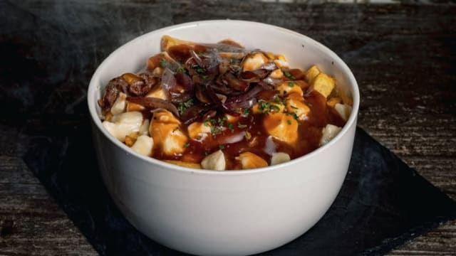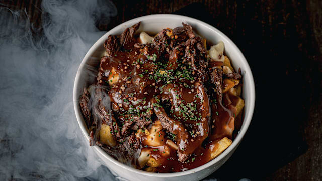 Sauce brune, trio de poivrons grillés, fromage en grains du québec, brisket de bœuf de galice