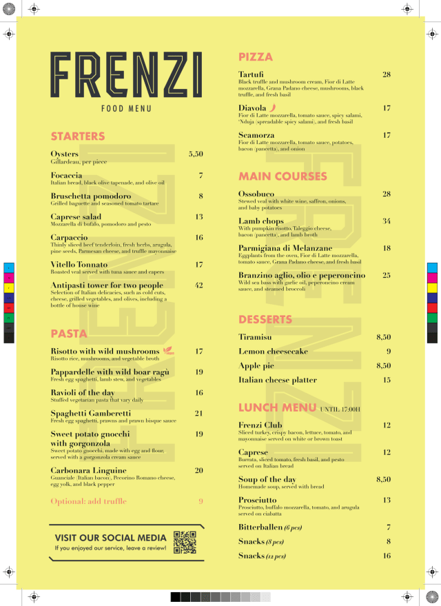 10/10What a wonderful little cafe/restaurant we stumbled across in our never-ending search to find tasty, affordable food in Amsterdam! Frenzi has a smallish menu, but everything we've tried has been delicious--so good the first night (black truffle pizza with a mellow Montepulciano) that we ate dinner there again the next night, making a reservation to make sure we didn't miss out on the special of the week, veal saltimbocca. Elizabeth, our server both nights, was extraordinary--great sense of humor and so attentive. She was also helpful with answering questions we had about A'dam. Frenzi is popular for its outdoor seating, most of it along a major canal, and for its intimate indoor dining space. Be sure to make a reservation after 6:00 though, especially if it's going to rain; it's popular!