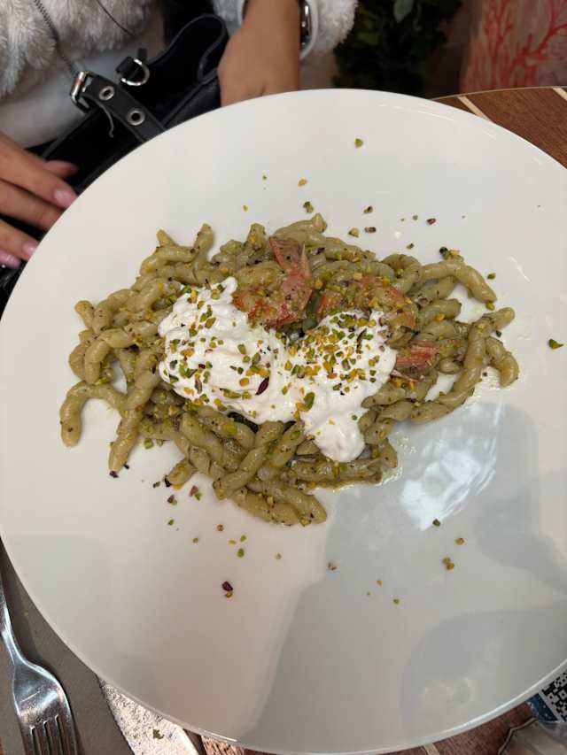 - Mortadella, crema di pistaccchio, granella di pistacchio, grana, mozzarella, basilico, olio EVO