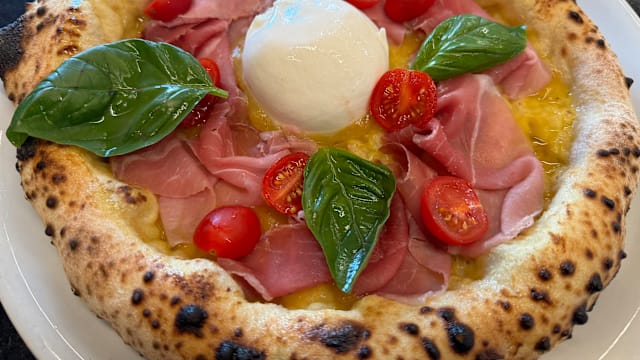 Bufala, pom. san marzano, bufala in cottura, parmigiano, basilico e olio EVO