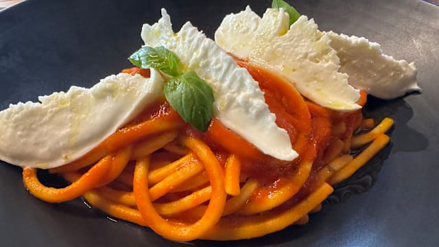 Scarpetta, velo di pomodoro, datterino rosso confit, mozzarella di bufala, basilico fritto, olio evo e scaglie di parmigiano