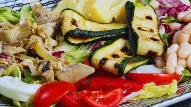Insalata mista, pomodorini, patate, fagioli, carciofi e zucchine alla griglia