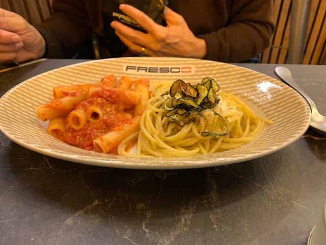 Les deux incontournables de notre carte réunis dans une seule assiette - pour ceux qui n’arrivent vraiment pas à choisir: duo de spaghetti alla nerano et des ziti allo scarpariello.