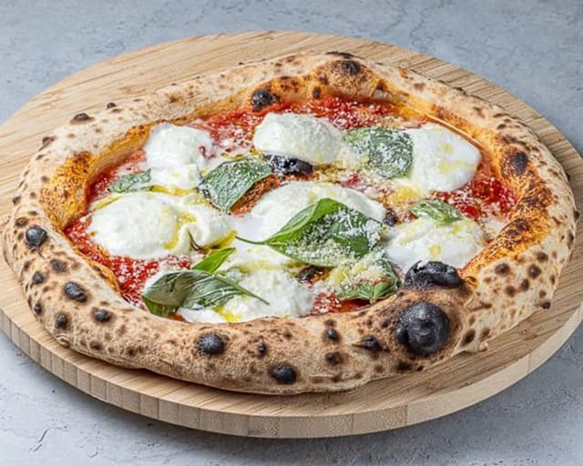 Burrata crémeuse accompagnée de tomates cerises, feuilles de basilic fraîches et noix croquantes.