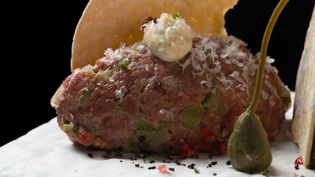 Tartar de ternera con mayonesa de trufa y parmesano. Sabroso y elegante con un toque cremoso. Alergenos: Huevos, Leche, Gluten