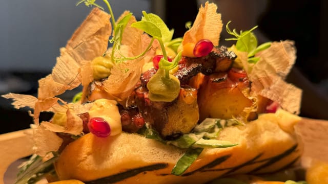 Perrito con pulpo, verduras asadas y patatas. Original y jugoso. Alergenos: Huevos, Moluscos, Gluten