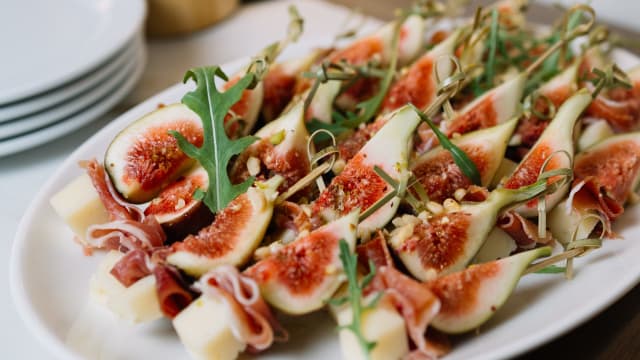 Aguacate a la parrilla con ciruela roja, tomates cherry, granada y hierbas frescas, con salsa de teriyaki y lima. Decorado con pistachos para un toque de sabor intenso. Alergenos: Pescado, Frutos de cascara, Soja