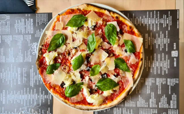 - Mozzarella, provola affumicata, prosciutto cotto di praga, scaglie di grana, miele e basilico