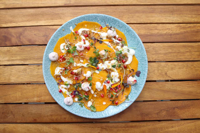 - Carpaccio de calabaza con queso ricotta, granada y nueces