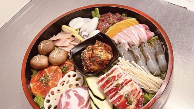 Bife de vaca com cebola, barriga de porco, batata doce, carne de porco preto, camarão, perna de frango picante, cogumelos enokitake, choco, peito de vaca