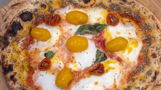 Cacio cavallo, mozzarella, salsa di pomodori gialli, pomodorino fiaschetto di torre guaceto, glassa al vincotto (impasto con farina multicereali)