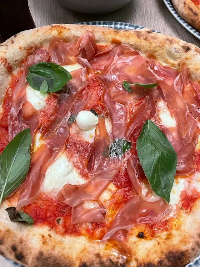 - Fior di latte campano, cipolletta fresca, funghi porcini, prosciutto cotto, scaglie di provolone del monaco, olio EVO e basilico