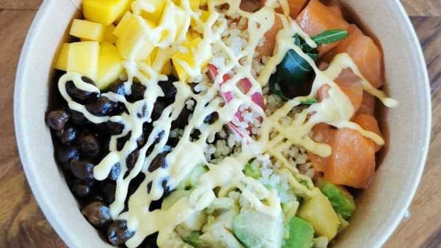- Riso venere, polpo fritto, gamberi in tempura, avocado, carote,cetrioli, pomodorini, teriyaki e pasta kataifi