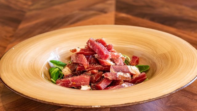 - Crema di pomodoro secco, capocollo di martina franca, bufala e glassa balsamica