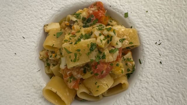 [Paccheri with mixed seafood, extra virgin olive oil, garlic and parsley]