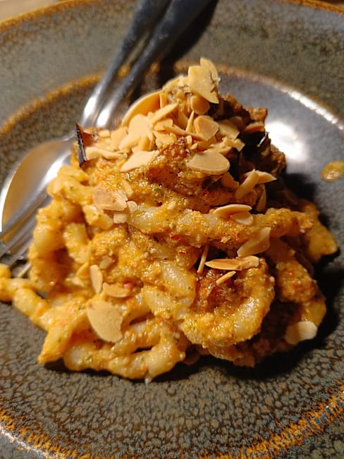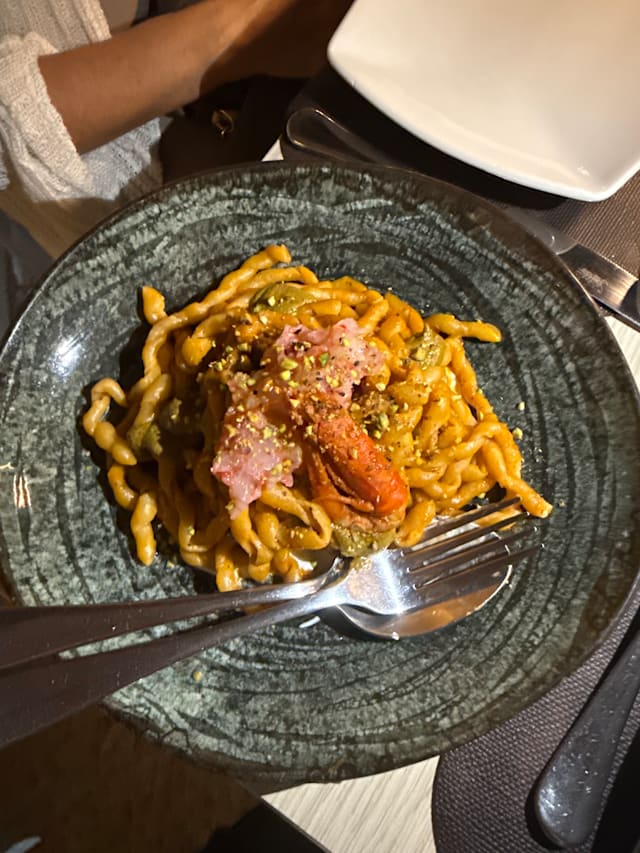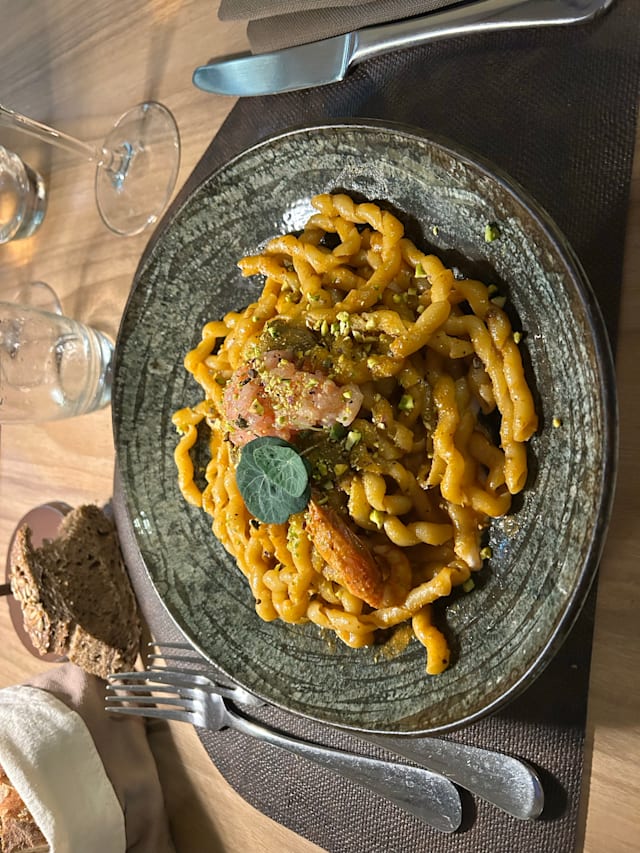 7.5/10Fantastic location. Busiate was not fully cooked. Side dish was very plain and tomatoes still green. Dessert was really something special, great attention to detail. I found a cork in my glass. The refill came from the same bottle, and I found pieces of cork later again (but left it). Overall experience was ok.