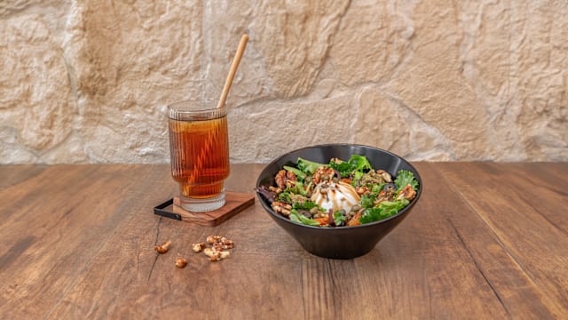 Burrata crémeuse, pesto maison, roquette, tomates cerises, olives noires, câpres, noix concassées grillées, filet de balsamique. Fraîcheur, équilibre et caractère.