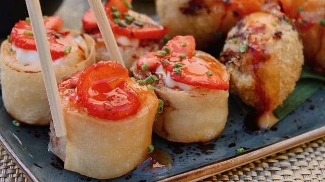 - Camarão panado, manga, queijo creme, ovos de peixe, cebolinho com molho de sweet chili