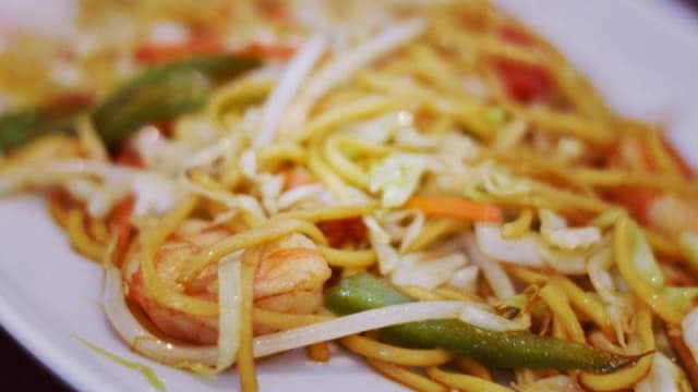 - Láminas de pasta de arroz al wok acompañado de vegetales y tortilla