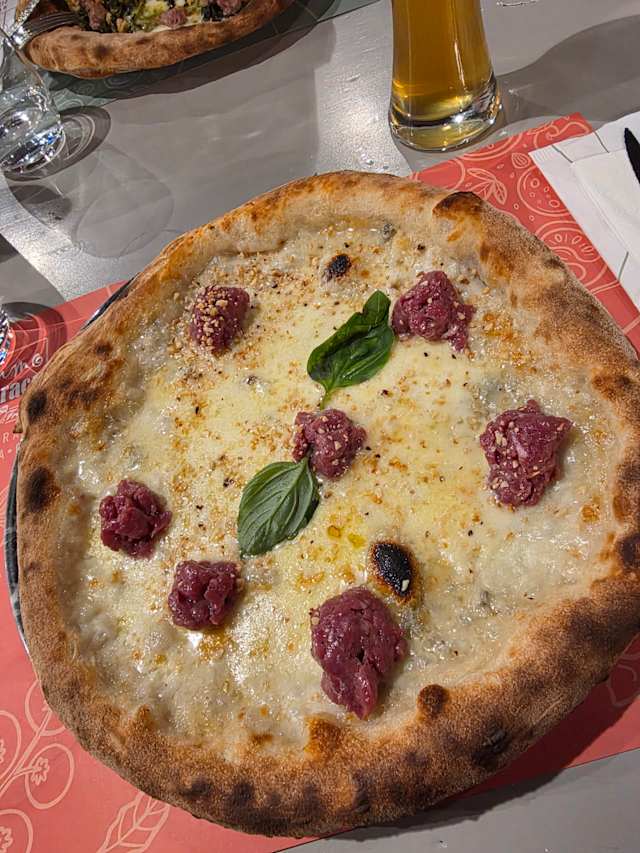 - Pulled pork di nostra produzione, cipolla caramellata, stracciatella di bufala sbriciolata di cinghiale, porcini e blue di bufala