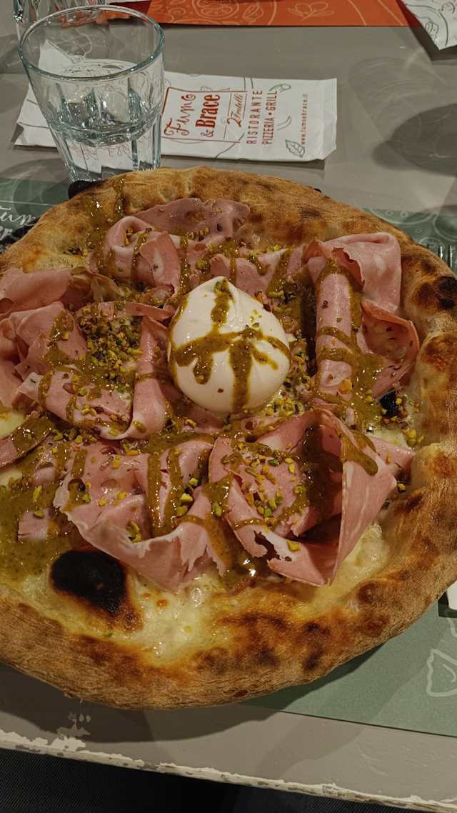 - Burratina pugliese pesto di pistacchi e mortadella, vellutata di pomodoro, grana e basilico, carbocrema e guanciale croccante