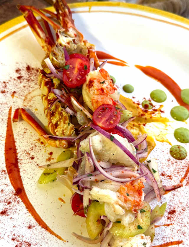 - Tomato, red onion, celery, langoustine, prawns, and lobster
