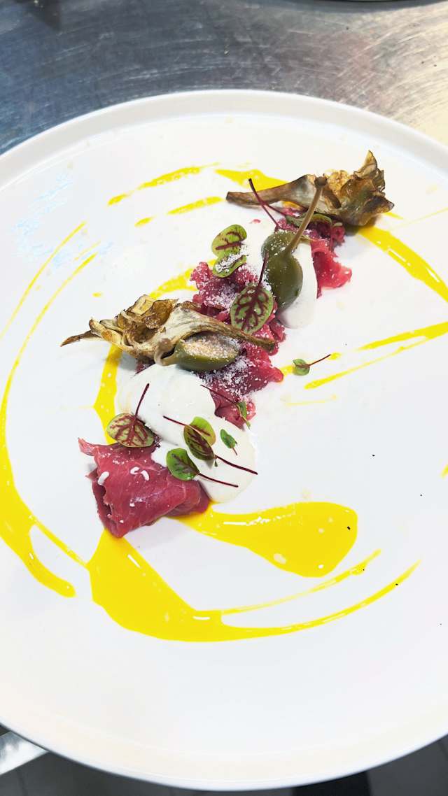 - With salted zabaione, crispy artichoke, and pecorino cheese fondue