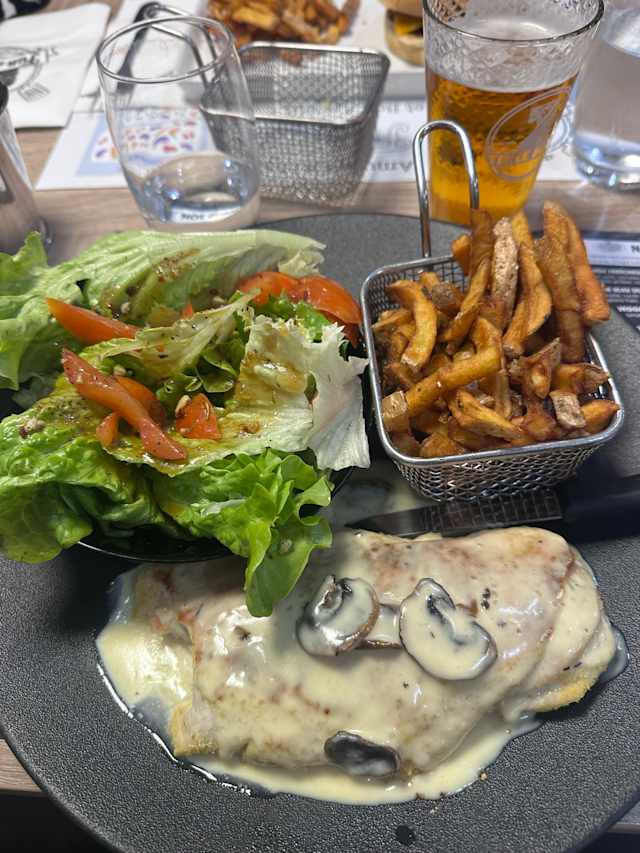 - Steak pur boeuf 150g, munster,galette de pomme de terre, oignons caramélisés, poitrine fumée, sauce aioli