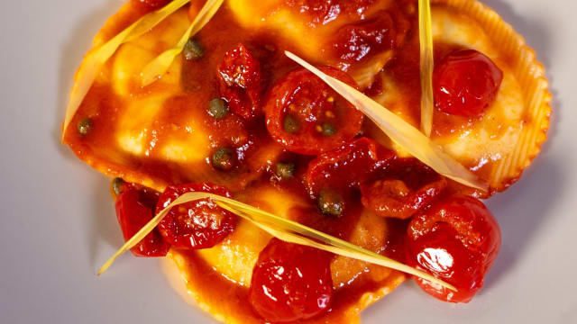 Mortadella di nero calabro, fiordilatte, stracchinato di capra, crema al pistacchio, limone, olio evo riserva olearia s. giorgio