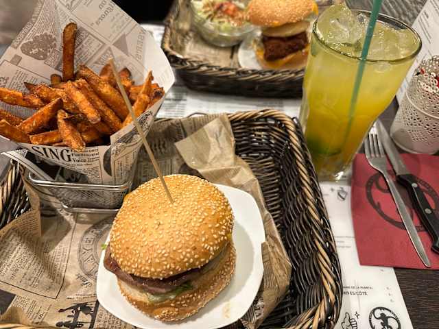 8.5/10Nice food - we really appreciated having a choice of burger size (kind of S,M,L) and such a range of burgers! Nice twist on a fondant au chocolat as well. Service was a bit slow but I’m pretty sure we could’ve called someone over if we hadn’t been chatting so much. Staff were nice in any case! We’ll be going back.