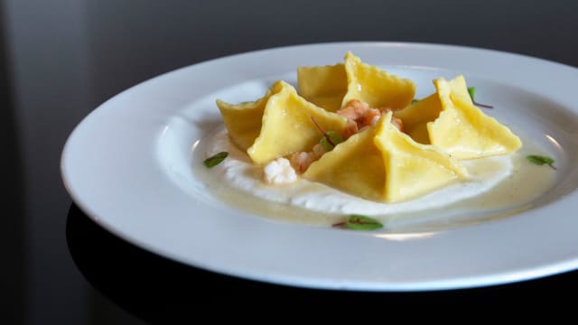 Fagottino ripieno di burrata con gambero, limone e stracciatella locale