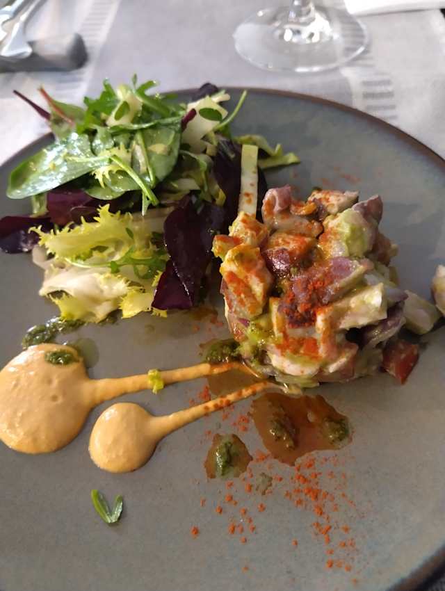 - Poulpe mariné à l’ail, jeunes pousses, mesclun, courgettes, tomates de saison