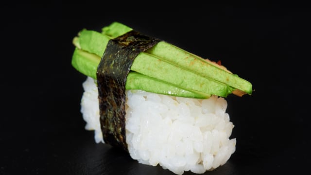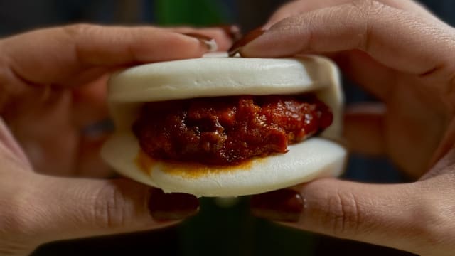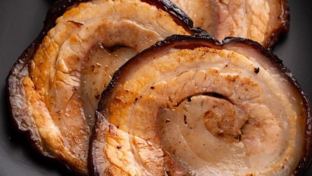 Maiale brasato in salsa di soia, mirin e vino rosso campano. I frigitelli lo accompagnano: verdi, dolci, scottati. Il temaki ha cambiato forma, non carattere.