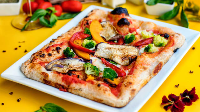 Salsa orientale al pepe nero, pancetta, verdure di stagione, mozzarella, pecorino romano