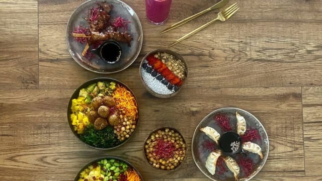 - Riz, falafels ou gyoza veggie, carotte, concombre, avocat, choux rouge, cacahuetes, sauce sucré