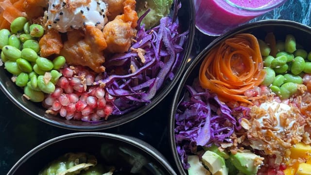 - Riz, saumon, mangue, grenade, carotte, edamame, oignons frits, sauce mayo sriracha