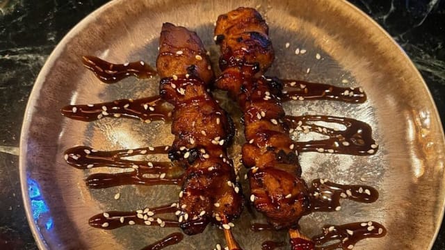 - "Tendre duo de brochettes de poulet, sauce yakitori sucré"