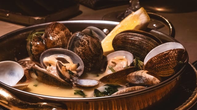 Tradicionais amêijoas à bulhão de pato e pão torrado