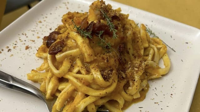 Paccheri cacio pepe, ragù di culatello e colatura di stracciatella