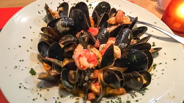 5.5/10Insalata Caprese: Tomotoes watery, buffala good, but served as big blob. Linguini Frutta de Mare: Tomato sauce harsh, too many mussels broken, shrimp rubbery. House red: acceptable.
