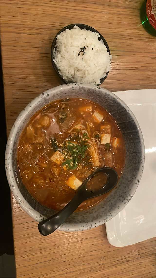 - Riso bianco al vapore , verdure di stagione con accompagnamento di straccetti di maiale piccante (Jeyuk)