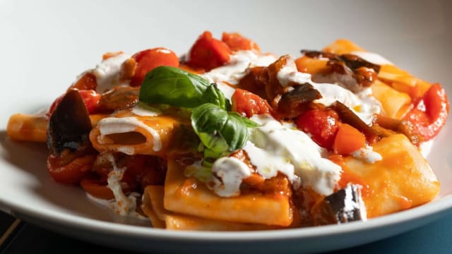 Paccheri freschi al pomodoro e basilico con melanzane fritte e crema di burrata