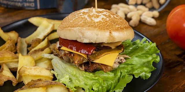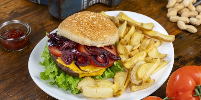 Pane con burger di manzo 180 gr con pomodoro fresco, insalata, cipolla caramellata e patate fritte