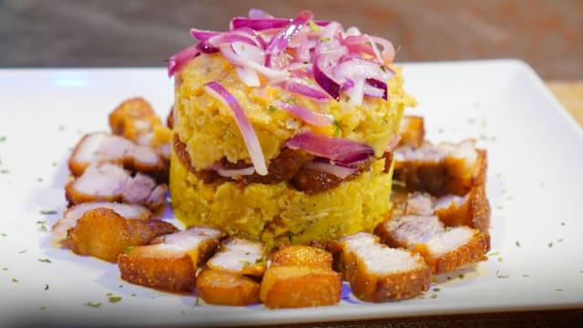 Mangú de yuca relleno de chicharrón