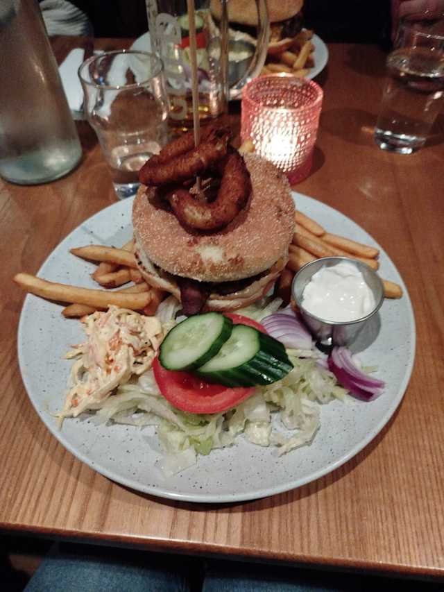 - Bacon, coleslaw, lökringar, ost, bearnaisessås och pommes frites