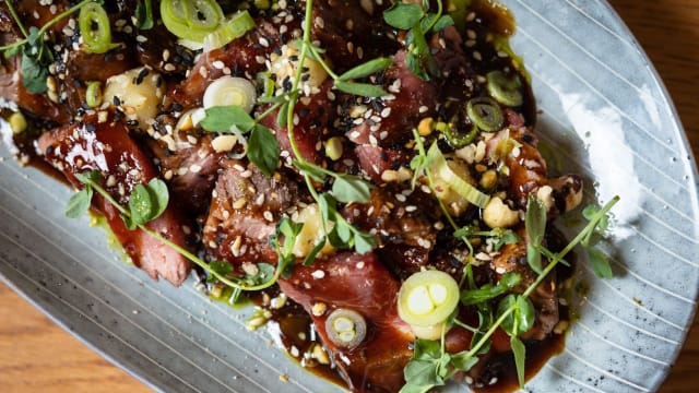 - #Boeuf #Aubrac #Marinade #Soja #Ponzu #Lime brûlé #Croûtons #Mayonnaise wakamé