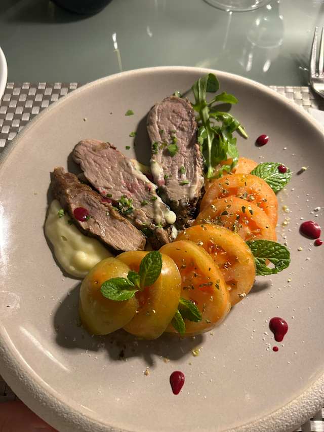 - Maialino cotto a bassa temperatura con insalata di pomodorino al basilico