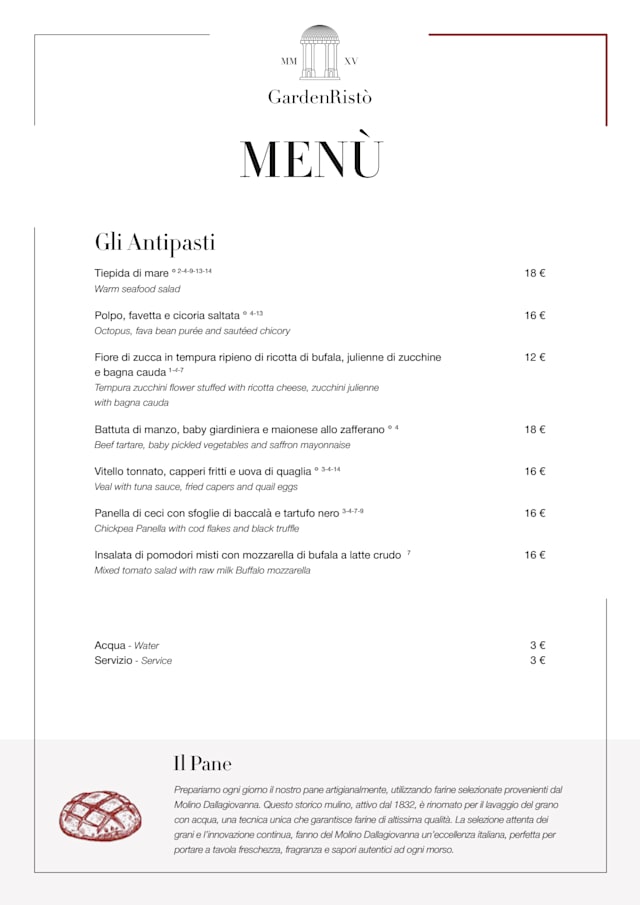 9.5/10Great menu of the day. Lovely garden seating. Pleasurable and quiet dining experience. The pasta alla gricia was especially delicious and the grilled vegetables were flavorful