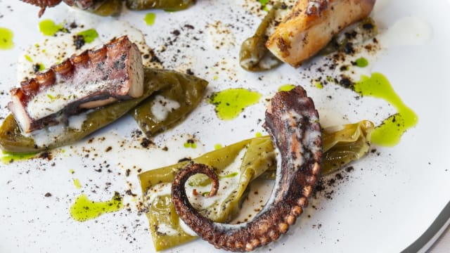 - Polpo arrostito, friggitelli alla brace, colatura di provola e polvere di cipolla bruciata
