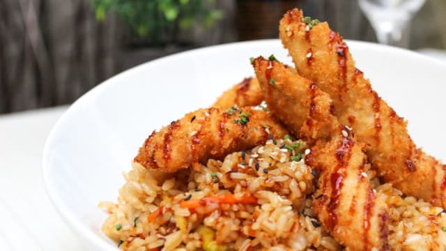 filete de cerdo empanado al estilo coreano con almendras tostadas